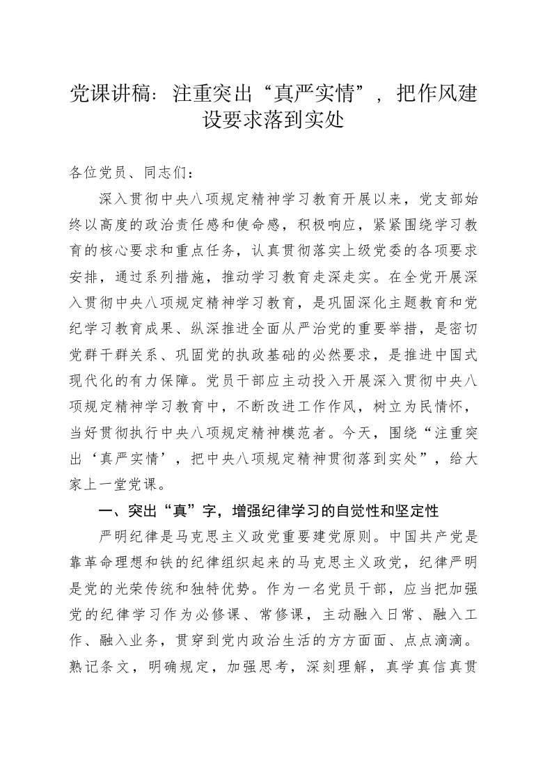 党课讲稿:注重突出“真严实情”,把作风建设要求落到实处各位党员、同志们:深入贯彻中央八项规定精神学习教育开展以来,党支部始终以高度的政治责任感和使命感,积极响应,紧紧围绕学习教育的核心要求和重点任务,认真贯彻落实上级党委的各项要求安排,通过系列措施,推动学习教育走深走实。在全党开展深入贯彻中央八项规定精神学习教育,是巩固深化主题教育和党纪学习教育成果、纵深推进全面从严治党的重要举措,是密切党群干群关系、巩固党的执政基础的必然要求,是推进中国式现代化的有力保障。党员干部应主动投入开展深入贯彻中央八项规定精神学习教育中,不断改进工作作风,树立为民情怀,当好贯彻执行中央八项规定精神模范者。今天,围绕“注重突出‘真严实情’,把中央八项规定精神贯彻落到实处”,给大家上一堂党课。一、突出“真”字,增强纪律学习的自觉性和坚定性严明纪律是马克思主义政党重要建党原则。中国共产党是靠革命理想和铁的纪律组织起来的马克思主义政党,纪律严明是党的光荣传统和独特优势。作为一名党员干部,应当把加强党的纪律学习作为必修课、常修课,主动融入日常、融入工作、融入业务,贯穿到党内政治生活的方方面面、点点滴滴。熟记条文,明确规定,加强思考,深刻理解,真学真信真贯