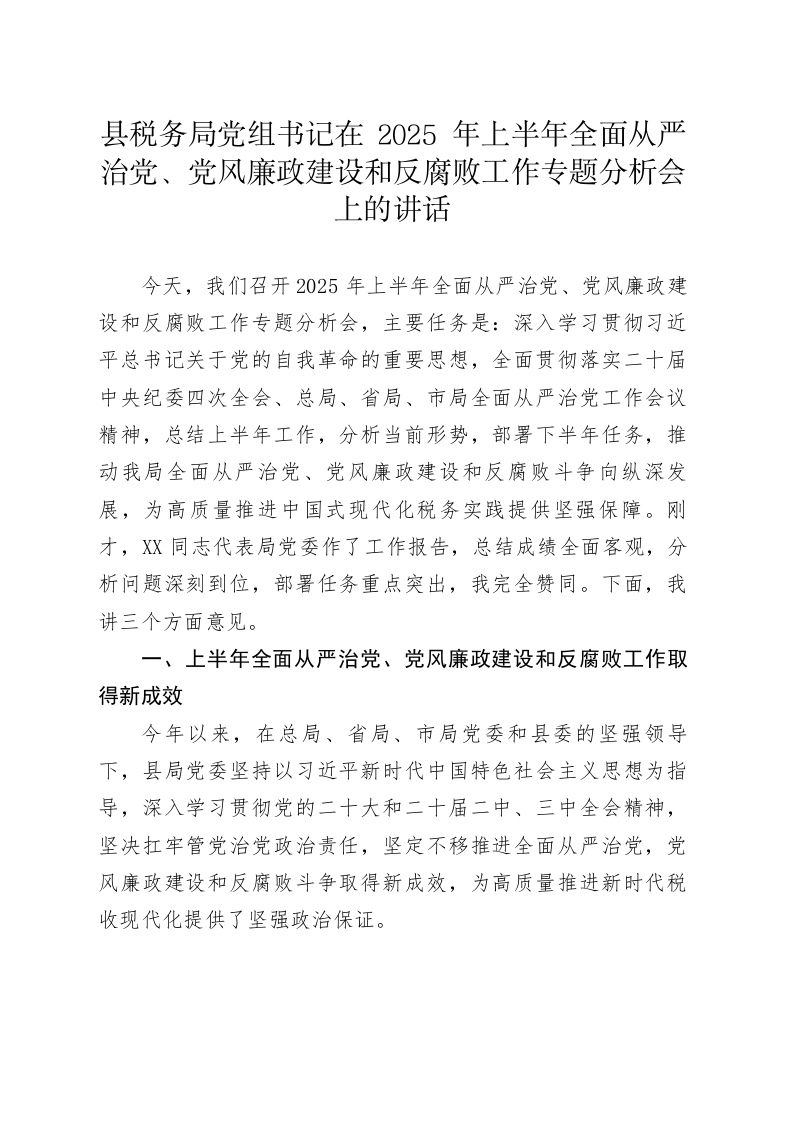 县税务局党组书记在2025年上半年全面从严治党、党风廉政建设和反腐败工作专题分析会上的讲话今天,我们召开2025年上半年全面从严治党、党风廉政建设和反腐败工作专题分析会,主要任务是:深入学习贯彻习近平总书记关于党的自我革命的重要思想,全面贯彻落实二十届中央纪委四次全会、总局、省局、市局全面从严治党工作会议精神,总结上半年工作,分析当前形势,部署下半年任务,推动我局全面从严治党、党风廉政建设和反腐败斗争向纵深发展,为高质量推进中国式现代化税务实践提供坚强保障。刚才,XX同志代表局党委作了工作报告,总结成绩全面客观,分析问题深刻到位,部署任务重点突出,我完全赞同。下面,我讲三个方面意见。一、上半年全面从严治党、党风廉政建设和反腐败工作取得新成效今年以来,在总局、省局、市局党委和县委的坚强领导下,县局党委坚持以习近平新时代中国特色社会主义思想为指导,深入学习贯彻党的二十大和二十届二中、三中全会精神,坚决扛牢管党治党政治责任,坚定不移推进全面从严治党,党风廉政建设和反腐败斗争取得新成效,为高质量推进新时代税收现代化提供了坚强政治保证。