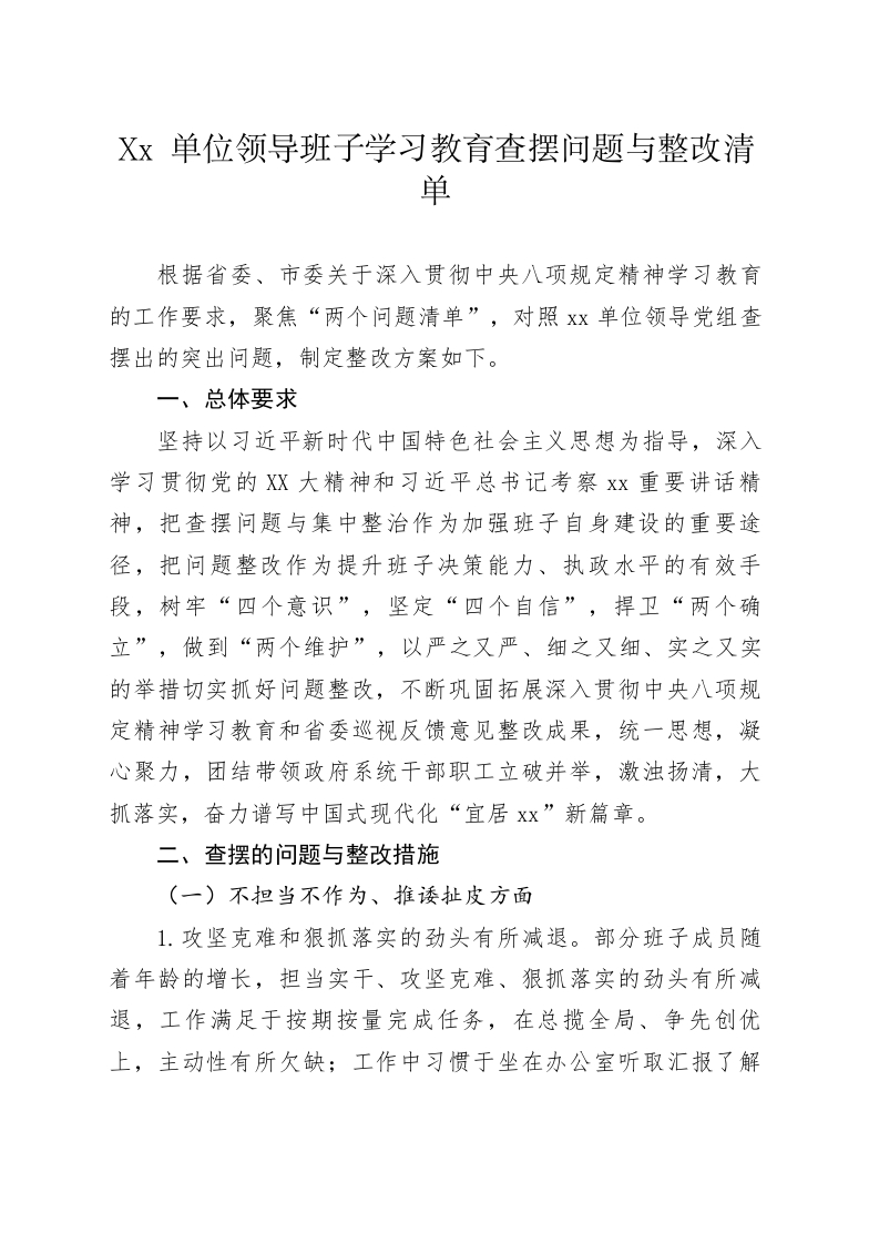 Xx单位领导班子学习教育查摆问题与整改清单根据省委、市委关于深入贯彻中央八项规定精神学习教育的工作要求,聚焦“两个问题清单”,对照Xx单位领导党组查摆出的突出问题,制定整改方案如下。一、总体要求坚持以习近平新时代中国特色社会主义思想为指导,深入学习贯彻党的XX大精神和习近平总书记考察xx重要讲话精神,把查摆问题与集中整治作为加强班子自身建设的重要途径,把问题整改作为提升班子决策能力、执政水平的有效手段,树牢“四个意识”,坚定“四个自信”,捍卫“两个确立”,做到“两个维护”,以严之又严、细之又细、实之又实的举措切实抓好问题整改,不断巩固拓展深入贯彻中央八项规定精神学习教育和省委巡视反馈意见整改成果,统一思想,凝心聚力,团结带领政府系统干部职工立破并举,激浊扬清,大抓落实,奋力谱写中国式现代化“宜居xx”新篇章。二、查摆的问题与整改措施(一)不担当不作为、推诿扯皮方面1.攻坚克难和狠抓落实的劲头有所减退。部分班子成员随着年龄的增长,担当实干、攻坚克难、狠抓落实的劲头有所减退,工作满足于按期按量完成任务,在总揽全局、争先创优上,主动性有所欠缺;工作中习惯于坐在办公室听取汇报了解