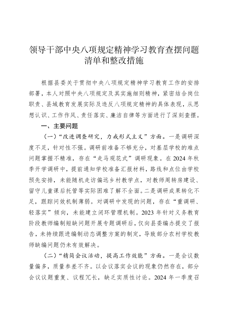 领导干部中央八项规定精神学习教育查摆问题清单和整改措施根据县委关于贯彻中央八项规定精神学习教育工作的安排部署,本人对照中央八项规定及其实施细则精神,紧密结合岗位职责、县域教育发展实际及违反八项规定精神的具体表现,从思想认识、工作作风、责任落实、廉洁自律等方面进行了深刻查摆。一、主要问题(一)“改进调查研究,力戒形式主义”方面。一是调研深度不足,针对性不强。调研前准备不够充分,对基层学校的难点问题掌握不精准,存在“走马观花式”调研现象。在2024年秋季开学调研中,提前通知学校准备汇报材料,路线和点位由学校预先安排,未能随机走访偏远乡村教学点,对教师周转房建设、留守儿童课后托管等实际困难了解不全面。二是调研成果转化不足,跟踪问效机制薄弱。对调研中发现的问题,存在“重调研、轻落实”倾向,未能建立闭环管理机制。2023年针对义务教育阶段教师编制短缺问题开展专题调研后,仅向县委编办提交了报告,未持续跟进编制动态调整方案的制定,导致部分农村学校教师缺编问题仍未有效解决。(二)“精简会议活动,提高工作效能”方面。一是会议数量偏多,质量参差不齐。以会议落实会议的现象仍然存在,部分会议议题重复、议程冗长,缺乏实质性讨论。2024年一季度召