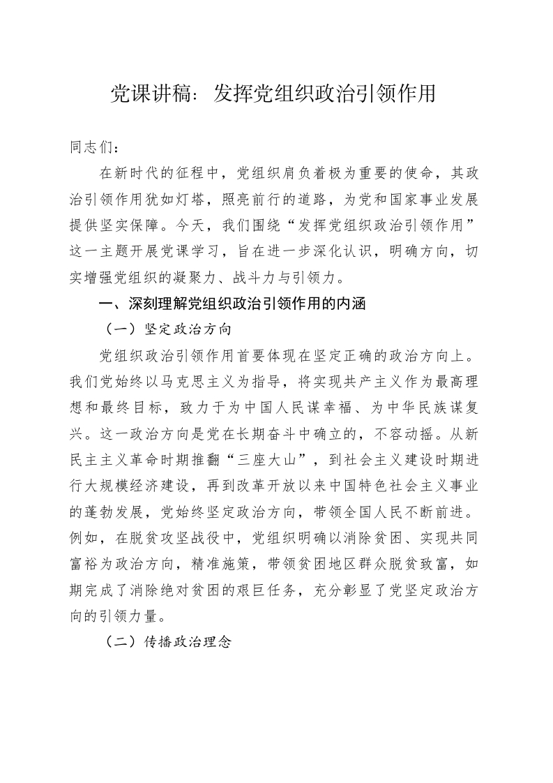 党课讲稿:发挥党组织政治引领作用同志们:在新时代的征程中,党组织肩负着极为重要的使命,其政治引领作用犹如灯塔,照亮前行的道路,为党和国家事业发展提供坚实保障。今天,我们围绕“发挥党组织政治引领作用”这一主题开展党课学习,旨在进一步深化认识,明确方向,切实增强党组织的凝聚力、战斗力与引领力。一、深刻理解党组织政治引领作用的内涵(一)坚定政治方向党组织政治引领作用首要体现在坚定正确的政治方向上。我们党始终以马克思主义为指导,将实现共产主义作为最高理想和最终目标,致力于为中国人民谋幸福、为中华民族谋复兴。这一政治方向是党在长期奋斗中确立的,不容动摇。从新民主主义革命时期推翻“三座大山”,到社会主义建设时期进行大规模经济建设,再到改革开放以来中国特色社会主义事业的蓬勃发展,党始终坚定政治方向,带领全国人民不断前进。例如,在脱贫攻坚战役中,党组织明确以消除贫困、实现共同富裕为政治方向,精准施策,带领贫困地区群众脱贫致富,如期完成了消除绝对贫困的艰巨任务,充分彰显了党坚定政治方向的引领力量。(二)传播政治理念